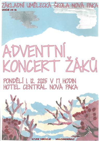 17:00 ADVENTNÍ KONCERT ZUŠ 1 prosince @ 17:00 ADVENTNÍ KONCERT ZUŠ Hrají, zpívají, vystavují, radost rozdávají - žáci všech oborů ZUŠ